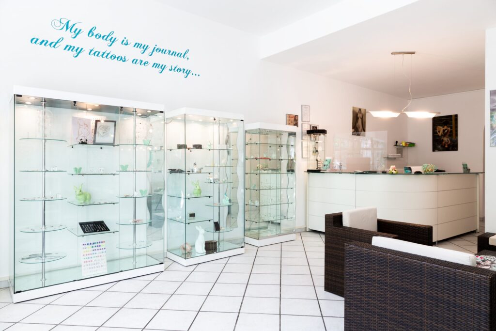 Sowohl der Piercing- als auch der Tattoobereich sind selbstverständlich von den übrigen Räumlichkeiten getrennt. So wird zum einen die Privatsphäre jedes Kunden geschützt und zum anderen die erforderlichen Hygienebedingungen stets eingehalten.